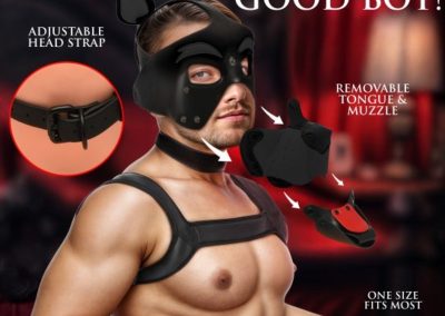Wearing your hood will transform you into a rough and rowdy pup anytime you want! The vegan leather feels like the real thing, but the hood is more breathable than full-coverage ones so you can wear it longer! The open eye-holes avoid that pesky problem of glass eyes fogging up. Your muzzle feels like an extension of your canine self, and you’re free to go nonverbal and bark or growl to make yourself understood!